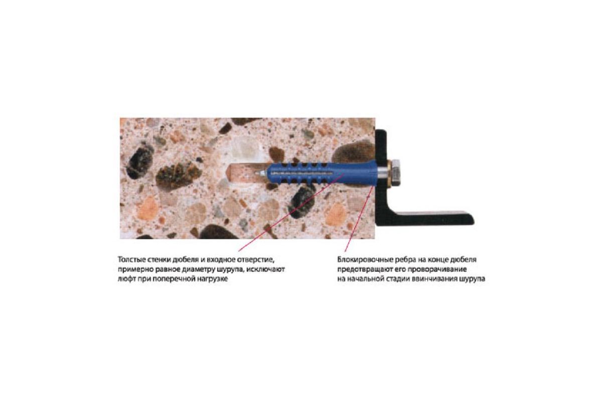 - Дюбель надежно фиксируется в основании, не проворачивается при ввинчивании шурупа, а также не допускает люфт шурупа.